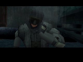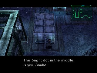 Got it, okay, I'm ready to go. (Snake takes off his scuba gear and watches the landscape slide by as the elevator ascends. The title appears on the screen "Metal Gear Solid". The elevator stops and Snake quickly runs out and looks for cover behind a storage crate.)