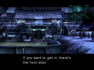 What about the air duct near the door? (Snake locates the duct but it is guarded, he pans up to the upper level of the facility.)